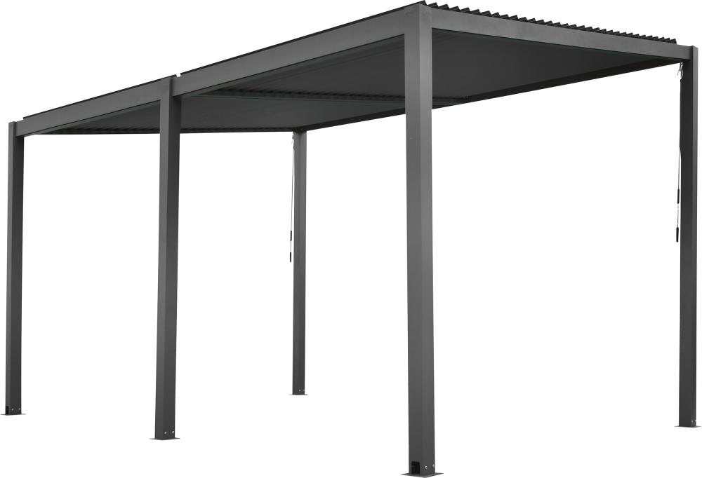 Formschön und modern, mit der edlen FLORAWORLD Pergola setzen Sie Akzente in Ihrem Garten. Hochwertiges Aluminium und das funktionelle Dach machen diese Pergola zu etwas ganz besonderem. Das innovative Lamellendach lässt sich mittels Handkurbel öffnen. In der geschlossen Position ist es natürlich absolut wasser- und lichtundurchlässig. In diesem Komplettset sind die Pergola, die Handkurbel und das Befestigungsmaterial zur Bodenmontage inbegriffen. In den vorderen Eck-Standfüßen ist das Wasserablaufsystem nahezu unsichtbar integriert. Für eine hervorragende Standsicherheit sorgen 9 x 9 cm starken Pfosten sowie Bodenplatten mit einem Außenmaß von 15 x 15 cm.